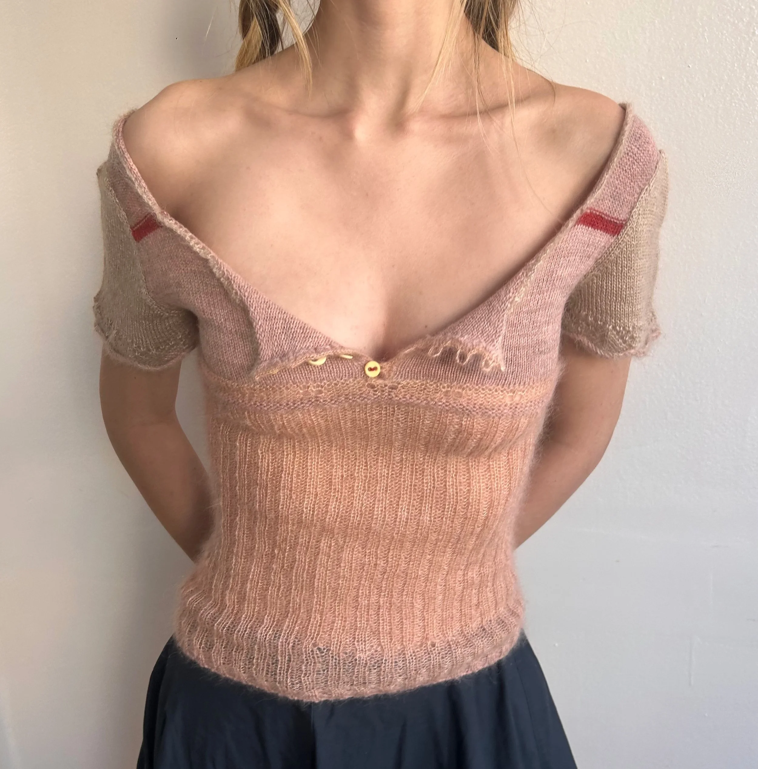 Bone button blouse in luxury rose mohair/ silk yarn with baby pink and red alpaca yarn bust